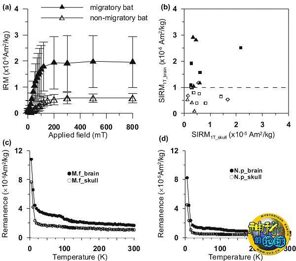针对蝙蝠磁导航机制科学问题,地质地球所地球深部结构与过程研究室博士后田兰香与合作导师潘永信研究员等,利用多种岩石磁学技术对6种蝙蝠(迁徙性和非迁徙性各3种)进行了详细分析,目的是研究蝙蝠体内是否存在铁磁性矿物作为感知地磁信号的受体。室温磁学研究结果清楚地表明,蝙蝠头部含有软磁性矿物颗粒;迁徙性蝙蝠脑组织内的磁性颗粒含量高于非迁徙性蝙蝠的(图1 a, b)。低温岩石磁学分析进一步揭示出该软磁性矿物为磁铁矿颗粒(图1 c, d)。