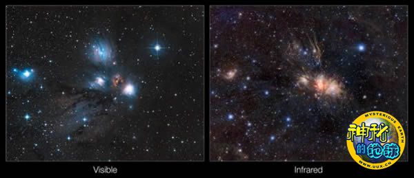 在可见光波段,这里一群大质量热恒星产生了一个非常漂亮的反射星云,之所以叫这个名字是因为这些尘埃和气体会反射来自附近亮星发出的光,绚丽多彩。在这张图像中,这颗蓝色亮星的光芒被外侧的暗色、迷雾般的星际分子云阻挡住了一部分,因而显得朦胧。