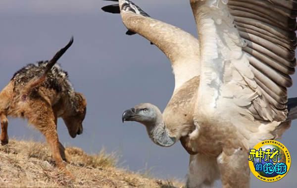 在人迹罕至的非洲平原,一谈到进餐时间,竞争就成了这一天的主旋律。所以,当一只饥肠辘辘的豺看到秃鹫独自享受美味的骨头时,一场你死我活的争斗就不可避免地上演了。