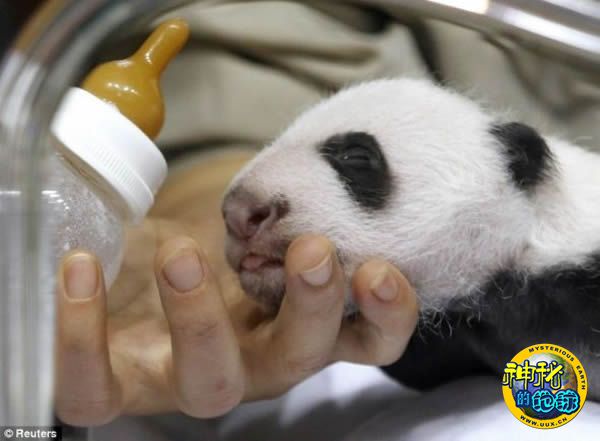 在7日的媒体见面会上,一名兽医用牛奶瓶喂大熊猫幼仔。