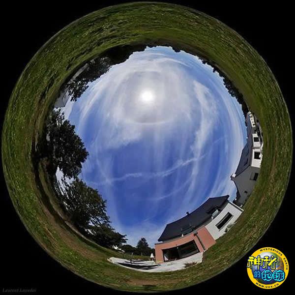 在这张由鱼眼相机捕捉的照片中,法国布列塔尼上空9月2日出现了两个大气圈。小圈(太阳处于其中心位置)被称为“22度光环”,因为这个圈的任意点同太阳的角度大概都为22度。当阳光或月光反射悬浮于地球大气层中的六边形冰晶,就会形成这种光环。据天体摄影术组织TWAN网站介绍,大圈(照片中央)是幻日环,比幻日或“22度光环”还罕见。