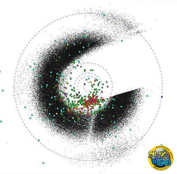 黑斑代表小行星,密密麻麻分布于太阳系的主要小行星带(位于火星和木星之间)。蓝色和黄色方块表示NEOWISE任务发现的彗星。绿色和红色小点最令人感到不安:它们代表距地球12.4万英里(20万公里)以内的近地天体。据美宇航局科学家介绍,平均计算,每隔10万年,就会有一颗直径在0.3英里(约合0.5公里)及0.3英里以上的小行星撞击地球,这种撞击会引起大规模生物灭绝事件。幸运的是,更小的小行星或彗星往往在到达地面以前,便在大气层中燃烧殆尽。