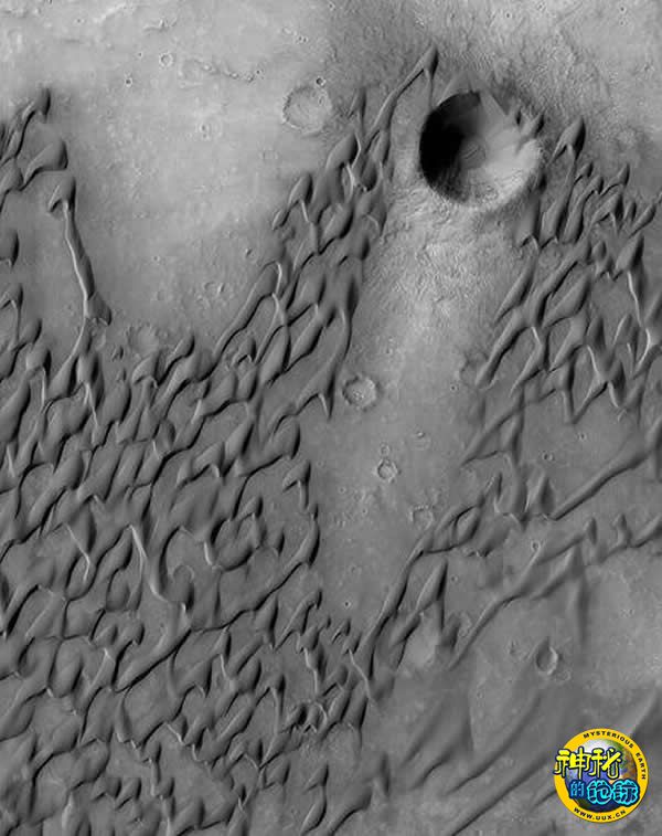 美国国家地理一周精彩太空照:麒麟座“恒星摇篮” 来源: 神秘的地球 时间:2010年10月14日 11:44 5.新月形火星沙丘 新月形火星沙丘(图片提供:NASA/JPL/University of Arizona) 在美宇航局火星勘测轨道飞行器HiRISE相机拍摄的这张单色照片上,新月形的火星沙丘呈现在我们面前。同地球上的沙丘一样,“赫歇尔”陨石坑中的这些沙丘是在大风不断吹动沙子时形成的。随着沙丘顺风扩展,它们合并后在沙丘边缘形成陡峭的“滑落面”。据HiRISE网站介绍,右上方的陨石坑因阻止沙丘在其后面移动而闻名,虽然它仍在不断积累着沙子。 新浪环球地理(孝文) 上一页12345 上一篇 下一篇