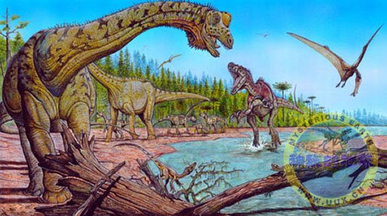 An artist's rendering depicts a newly discovered giant dinosaur (left and second from left) lumbering through its habitat some 80 million years ago.