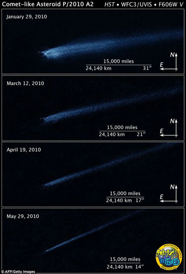 此图片显示了哈勃太空望远镜从2010年1月到5月的五个月期间所拍摄的四幅图像,显示了一个有着奇怪形状的碎片,可能来自两个小行星发生碰撞产生的。