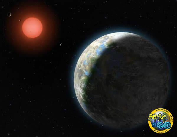 艺术构想图:红矮星“Gliese 581”和星系内层的四颗行星。红矮星“Gliese 581”距离地球大约20.5光年。前景中较大的行星就是新发现的“Gliese 581g”。“Gliese 581g”行星质量大约是地球的三到四倍。