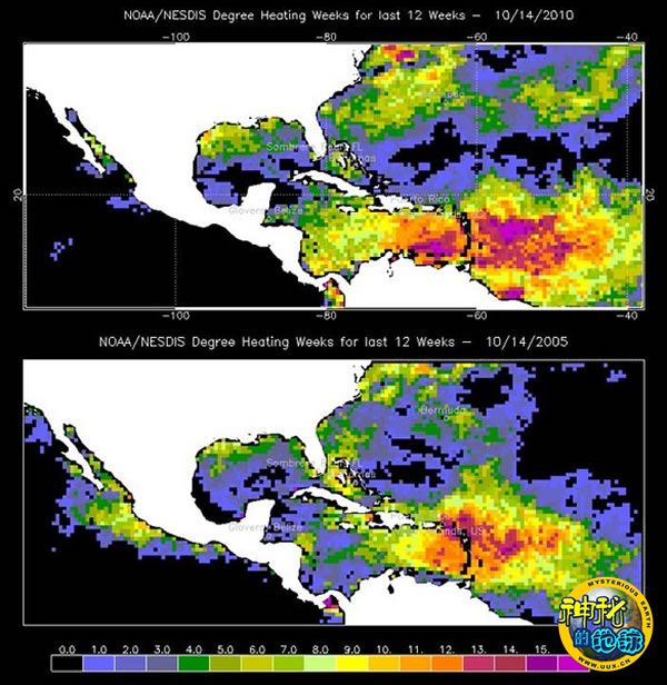 今年7月,NOAA发出警告说珊瑚可能又褪色了。现在,加勒比地区的温度地图显示,海水高温的持续时间已经比2005年那次还要长,影响区域也更大。