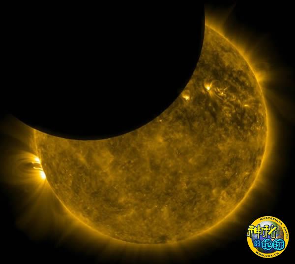 美国宇航局的“太阳动力学天文台”(SDO)正在从远紫外线波长范围内观察太阳,这时黑色的月球开始从它前面越过。从该图可以看到,卷须状的超热等离子体(即已知的太阳耀斑)伸向遥远的太空。像这样的等离子环(Plasma loops)的温度最高可达2000万摄氏度。向图片左侧奔去的等离子环的直径大约是86万英里(138.40万公里)。