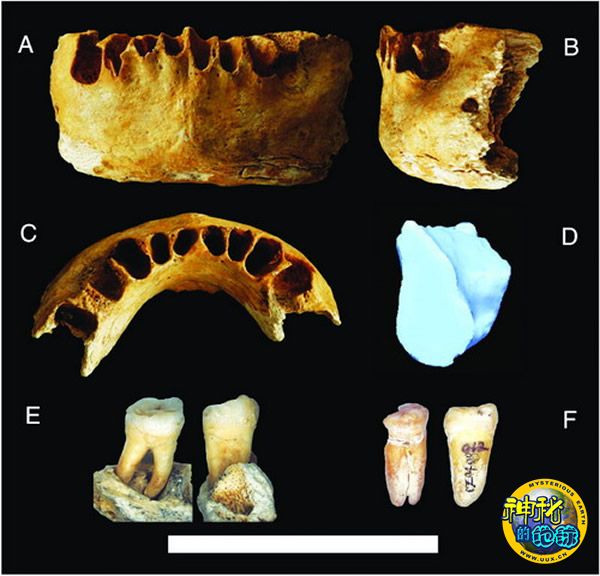 右图为在广西崇左木榄山智人洞发现的10万年前的人类化石(A下颌骨前面;B下颌骨左侧面;C下颌骨上面;D下颌联合中部激光扫描断面;E、F两枚牙齿的颊侧面和近中面)