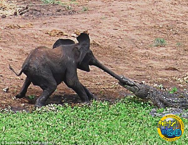 照片中,一头小象在象群的注视下走向布满水草的水坑饮水,不幸的是,这里还埋伏着一条饥饿难耐的鳄鱼。它突然从水中跃起并死死咬住小象的长鼻,于是乎双方开始了一场近似拔河的“拉锯战”。