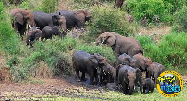 一旁的象群纷纷赶来施救。在象群地动山摇的声势面前,鳄鱼不得不选择放弃,躲进了水塘中。