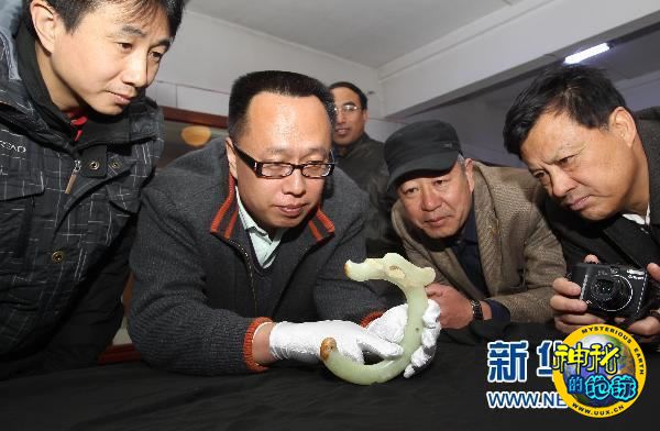 “华夏第一龙”红山文化黄玉龙出土地认定 来源: 神秘的地球 时间:2010年11月02日 10:46 内蒙古翁牛特旗文物普查队员在“华夏第一龙”出土地考察 翁牛特旗博物馆工作人员在展示“华夏第一龙” 中国社科院考古研究所研究员和翁牛特旗文物普查队员在观看国宝“华夏第一龙” 在近日进行的内蒙古第三次文物普查中,国家一级文物国宝“华夏第一龙”出土地经中国社科院考古研究所和翁牛特旗博物馆田野考古专家在翁牛特旗乌丹镇新地村东拐棒沟红山文化遗址区中寻找确定。据红山文化专家介绍,这件红山文化黄玉龙出土地的认定是中华文明探源工程红山文化研究的重要成果。 新华社记者汪永基摄 上一篇 下一篇 TAG: 红山文化 黄玉龙 华夏第一龙