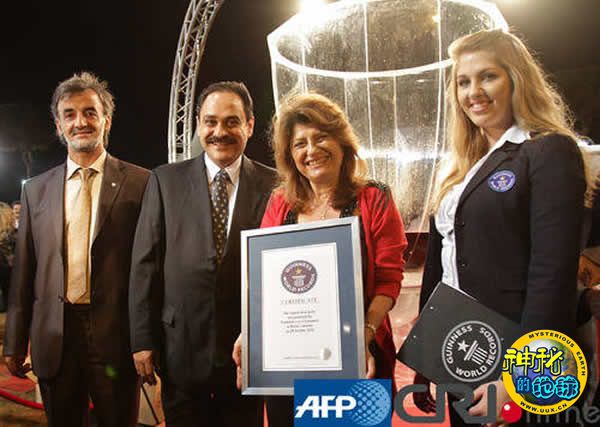 黎巴嫩制造世界最大酒杯打破吉尼斯世界纪录 来源: 神秘的地球 时间:2010年11月02日 11:23 黎巴嫩制造世界最大酒杯打破吉尼斯世界纪录 黎巴嫩制造世界最大酒杯打破吉尼斯世界纪录 黎巴嫩首都贝鲁特的工程师为迎接当地Vinifest酒节的到来,设计制作了一个2.4米高、直径1.65米的超大号酒杯。目前这个大酒杯已经获得吉尼斯世界纪录委员会的认证,成为世界上最大的酒杯。 AFP/国际在线 上一篇 下一篇 TAG: 吉尼斯 黎巴嫩 世界纪录 酒杯