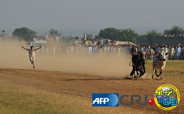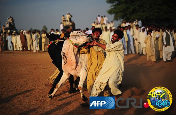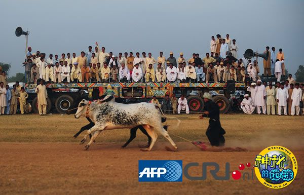巴基斯坦旁遮普省举办传统赛牛比赛 来源: 神秘的地球 时间:2010年11月02日 11:43 一头公牛在比赛中试图挣脱木头架子和绳子的束缚 一位选手摔倒后正奋力追赶自己的公牛 有不少人到现场观看这项传统的赛牛比赛 上一页12 上一篇 下一篇
