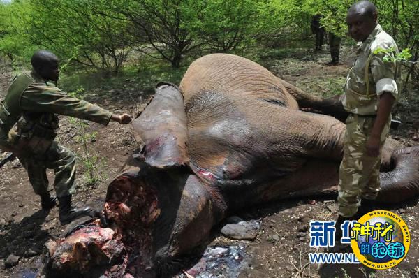 10月31日,肯尼亚野生动物保护局的执法人员站在一头被猎杀的大象尸体旁。