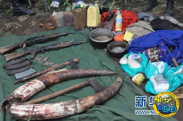 这张10月31日拍摄的照片显示逃跑的盗猎分子遗留下来的枪支弹药、斧头和部分从大象身上砍下来的象牙。