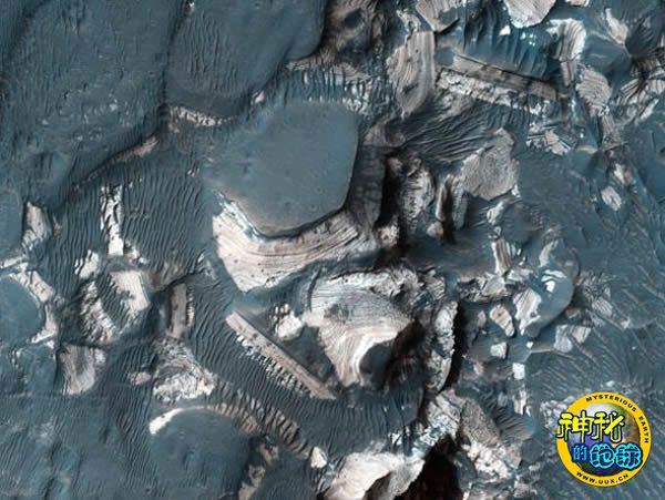 在美宇航局于10月21日公布的这张火星霍尔登陨石坑照片中,一层层鲜亮的岩石块嵌入到更暗的物质当中。照片是由火星勘测轨道飞行器拍摄的。层状岩石被认为是火星上洪水泛滥时,远古水体渗入霍尔登陨石坑边缘沉淀形成的。据美宇航局科学家介绍,这意味着层状岩石可能包含着火星历史上一个更湿润、更温暖时期的记录。由于霍尔登陨石坑已被列为美宇航局下一次探测任务(涉及“火星科学实验室”探测器)的四个候选地之一,科学家可能会在不久后有机会找到这方面的确凿证据。