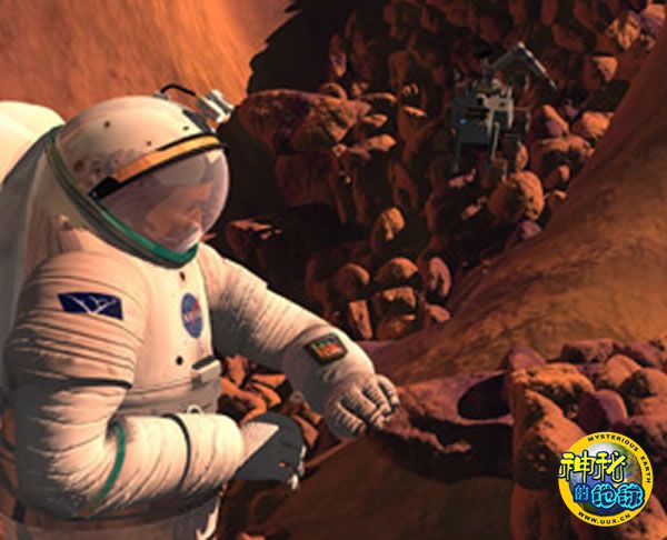 在艺术家对未来的设想中,宇航员收集火星表面的样本,同时机器人探险家在旁边提供帮助