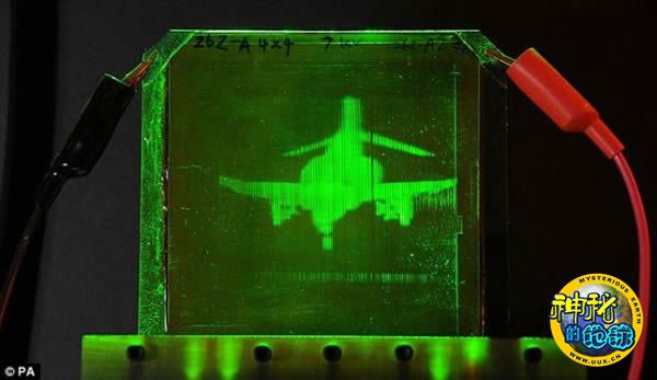 这是一种光致折变聚合体生成的F-4鬼怪喷气机的可刷新全息图,不用3D眼镜就能看到它。