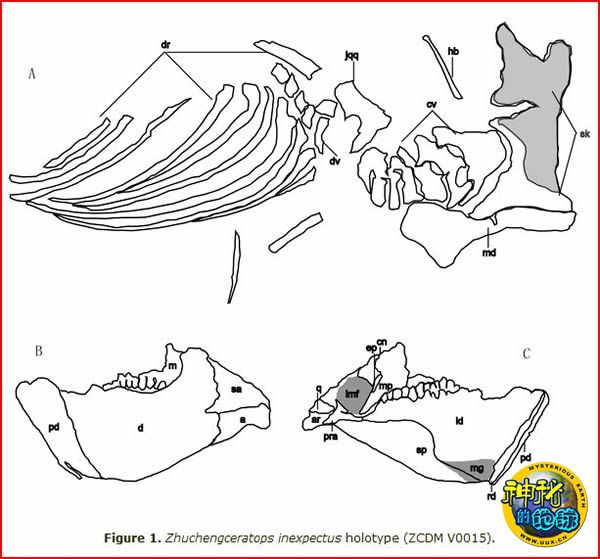 保存的诸城恐龙模式标本线条图(A)与左侧颅骨和侧面(B)及中间(C)角度的下颌骨。