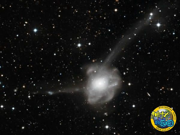 这张照片是由欧洲南方天文台设在智利的拉息拉天文台拍摄的,显示了气体和恒星被从碰撞在一起的星系剥离,笼罩在其共同核心周围,形成环状物质的画面。环状物质令星系的外形看上去十分奇特,让人不禁想起电子绕原子旋转的教科书插图。