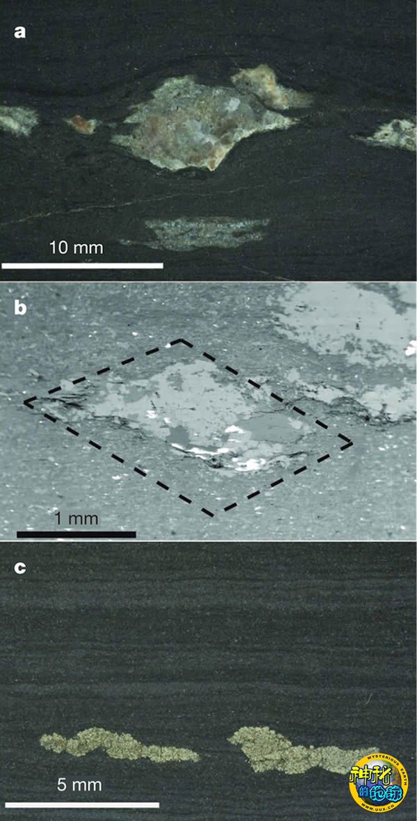 页岩中发现的硫化物显微照片a页岩中的石膏假晶,代表起初的硫化物。b重晶石的背散射电子成像以及形成石膏假晶的石英和方解石(菱形的轮廓非常清晰)c黄铁矿结核
