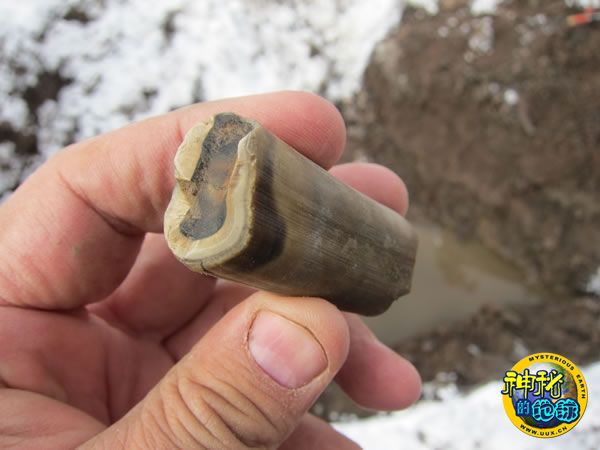 Johnson博士拿着一块树獭牙齿化石着士