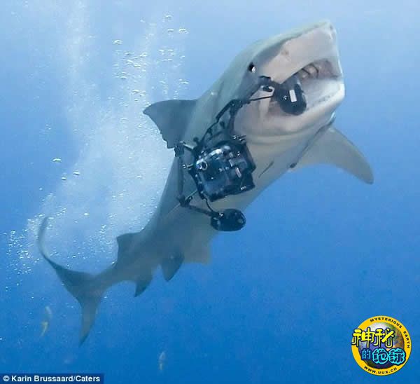 荷兰女摄影师卡琳·布鲁萨德用手中的照相机拍下了虎鲨抢劫全过程。她说:“当时共有大约六七头鲨鱼出现,我们简直不敢相信自己会如此幸运。我们一直在远处尽情拍摄,后来,一名潜水员向其中一头鲨鱼游了过去,试图拍摄更完美的照片。但这头鲨鱼突然发怒,从他的手中抢走了相机。我不敢相信这是真的,它带着相机大摇大摆地游走,而我们只能目瞪口呆地看着。幸运的是,鲨鱼最后还是扔掉相机。相机并没有什么大碍,只留下一些刮痕。”