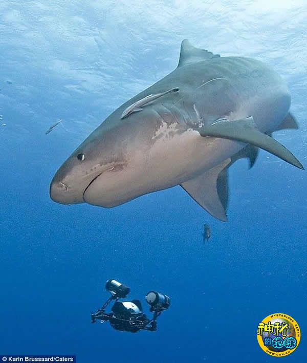 这头虎鲨在巴哈马海底实施抢劫,得手之后带着昂贵的照相机从容游走。