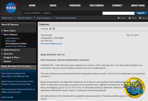 美国宇航局11月10日在其官方网站发布消息称,将于当地时间11月15日12点30分(北京时间17日凌晨1点30分)在其华盛顿总部电视演播室举行新闻发布会,就该局“钱德拉”X射线天文台在太空发现的异常物体进行实时转播解说。