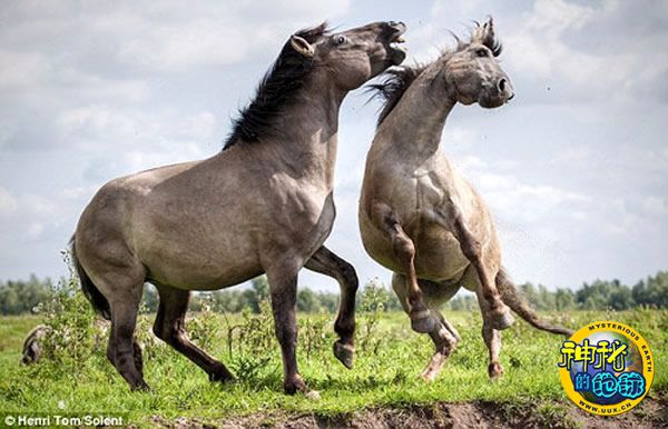 据英国媒体报道,一位摄影师在荷兰自然保护区内拍到了两匹雄性野马为争夺与母马的交配权而激烈大战的场面。