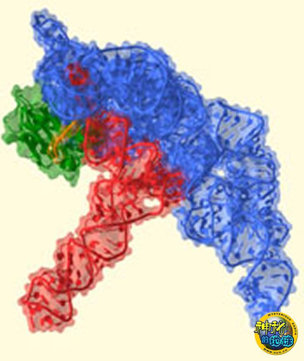 一旦RNA酶P识别了tRNA,就会停下来并被一个金属离子捕获,断开一个化学键,使tRNA转变成熟的、能参与生命活动的物质。RNA酶就是这样在细胞里一次又一次地运作着。