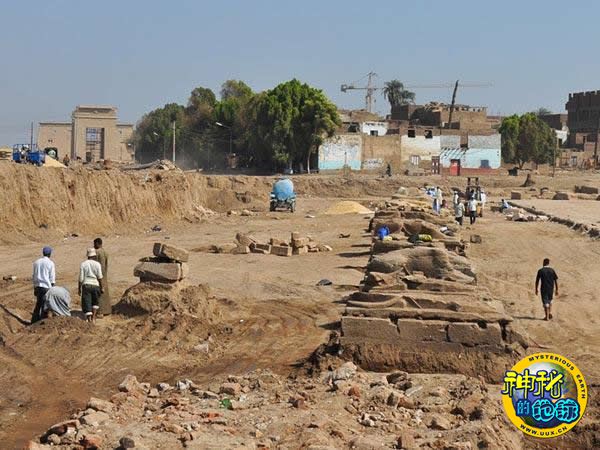 2尊狮身人面像(其中许多现已无头)排列在狮身人面像大道新发掘的尼克塔尼布路段的一端。迄今为止,在总长0.4英里(约合600米)的尼克塔尼布路段,只有约66英尺(约合20米)被发掘,这也是埃及政府将历史上有名的底比斯古城转变为现代旅游胜地的努力。