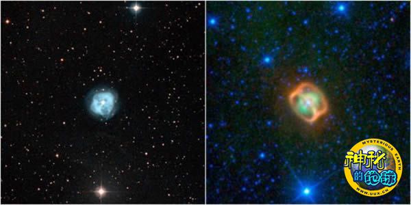 在可见光波段(左侧图像),NGC1514看上去和一般的星云没有什么区别。但在WISE的红外视野之中,则可以清晰看见它被几个松散的环状结构包围着,这一结果让人意外。 “这个天体已经被研究了200年,但是WISE的数据告诉我们,它仍可给我们带来惊喜,”赖斯勒说。”关于这一研究的成果已经发表于11月9日出版的《天文学杂志》上。