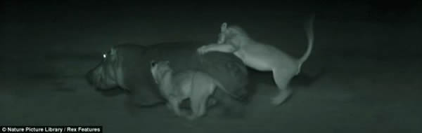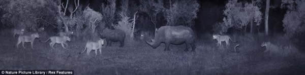 一群狮子团团围住两只犀牛。这些画面是在没使用人造光的情况下拍到的。