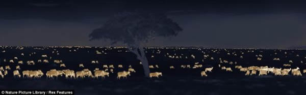 面对繁星点点的美丽星空,这些强健的牛羚显然被眼前的一切迷倒了。这张照片只是电影摄制者马丁·多尔恩拍摄的一系列令人难以置信的图片之一,他利用军事技术采用的成像仪器,向我们展现了以前从没有人看到过的肯尼亚马赛马拉野生动物保护区的画面。