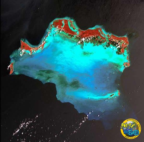 正如这张卫星照片所显示的那样,特克斯和凯科斯群岛(红色)主要位于凯科斯滩(青绿色)的北端。凯科斯滩是一个由石灰岩、沙子、藻类、珊瑚礁等构成的浅滩,面积约为2370平方英里(约合6140平方公里)。