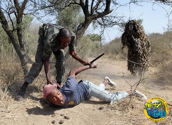 2010年9月,在南非沃特博格地区,反盗猎部队组织了一场演习,反盗猎部队突袭并逮捕了“盗猎者”。注意:右侧的那个人则是伪装的巡逻兵。在过去30多年间,南非一直致力于恢复日益下滑的犀牛数量并取得了一定的成果,犀牛数量也从20世纪50年代的数百头上升到大约21000头。然而,在过去2年间,许多盗猎者开始大肆捕杀非洲犀牛。