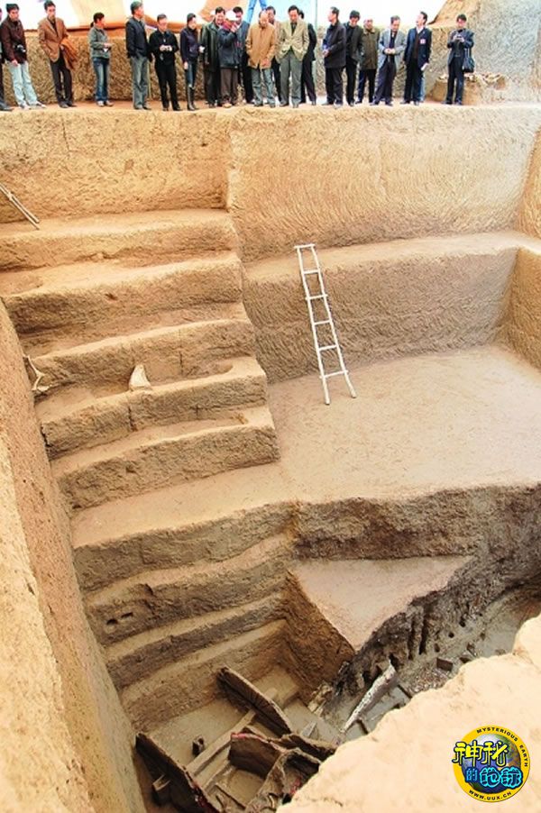 据负责现场考古发掘的考古专家周广济介绍,这种长方形竖穴带九级台阶墓道,墓道内随葬车马,又多在墓道北壁东端开挖土洞为墓室的墓葬,是一种新发现的墓葬形制。