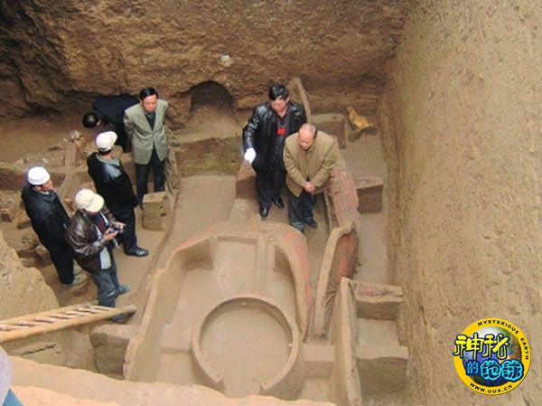 记者在考古挖掘现场看到:经过三个多月的挖掘,截至目前,该墓葬已成功清理出3个墓室。一号墓室墓基距地面有12米深,主要发掘出土了豪华的铜车及殉葬的马牛遗骸。记者发现,该马车虽经地下千年埋葬,但仍能看出车身颜色为黑红相间,车体锍金,车轱辘周围包铜,直径1.5米左右,整个车体大小与实物相同,依据车马装饰的豪华程度可以推测出,此车应是古时地位显赫人物出门乘坐的马车。相邻的二号墓室出土一具女尸,因墓内尚未发现有文字记载的东西,因此不能确定墓主的身份及确切年代,也无法断定二号墓室的女尸是不是墓主。
