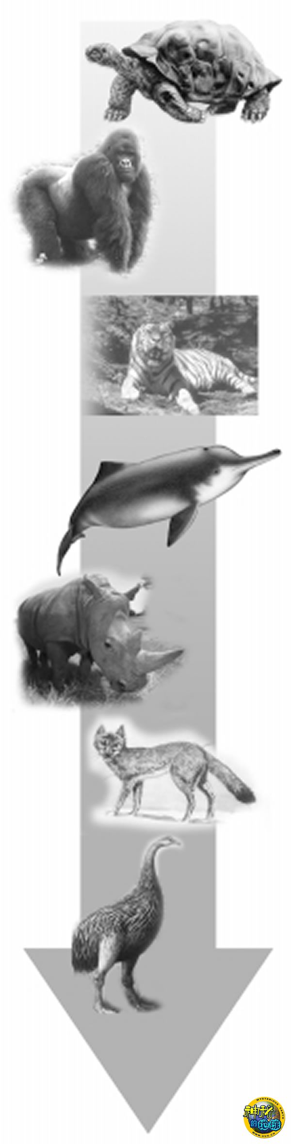 加拉帕戈斯象龟, 现存1只? 山地大猩猩, 现存不到700头 东北虎, 野生约400只白豚,灭绝于2006年? 刚果北部白犀牛, 1920年灭绝 南加州猫狐,1903年灭绝 恐鸟,1800年灭绝