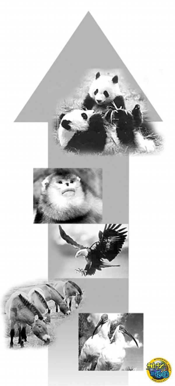 大熊猫,现存约1500头 滇金丝猴, 现存约2000只 白头海雕, 现存约百只 蒙古野马,现存几百匹 中国朱鹮, 现存近千只