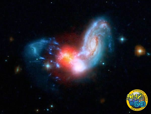 当两个星系合并在一起时,它们内部的巨大气体云团穿过彼此,形成密集的物质囊(pockets of matter),形成新的恒星。斯皮策望远镜从红外线范围看到的这个恒星形成团组(位于中心的红色斑点)爆炸,直径仅为700光年。根据它的亮度进行判断,天文学家认为这个区域每年形成的新恒星的质量是太阳的数百倍。