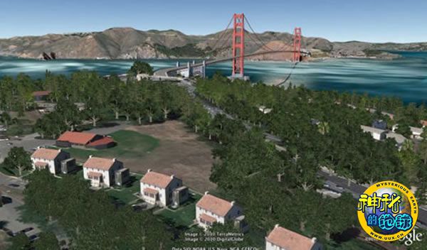 用谷歌地球6.0软件看美国旧金山金门大桥,树木看起来很逼真。