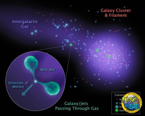 进一步研究证实了该发现确有价值:这两个星系团就像两片大岛屿,其间正是一滩“沙洲”,且在“沙洲”内部还横亘着一个回旋镖形状的罕见星系,距离Abell 1763中心大约1100万光年。甚大阵射电望远镜(VLA)和斯皮策太空望远镜检测出这个星系对红外光有异常的无线电波频率,天文学家形容其就像是一盏伫立在此的“灯塔”,并猜测可能当初是一个“流浪”到此的天体想穿越“沙洲”,但不幸被炽热气体“改造”并形成现在这副模样。