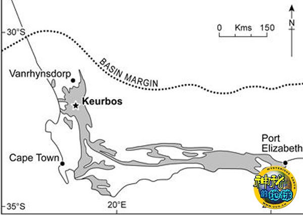 南非开普省,苏姆页岩(灰色)以及一个大型盆地构造就位于此。