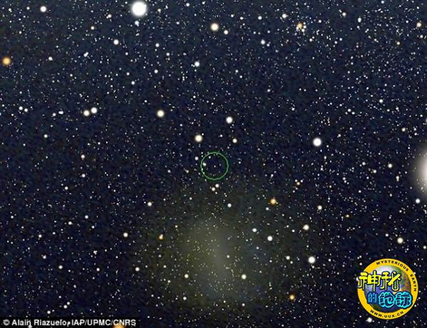 这是大麦哲伦星云未经假想黑洞扭曲作用之前的图像。图中绿圈是假想黑洞的中心位置。