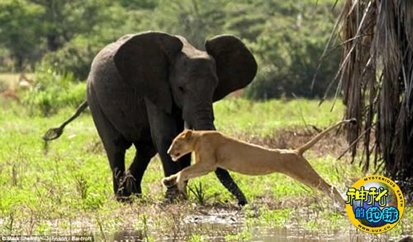 母狮子还算幸运,迅速逃出了公象的魔掌。