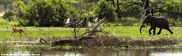 起初,母狮在公象的视野之内迅速逃窜,让公象大吃一惊。然而很快他就开始发起猛攻,证明自己是森林之王的能力。