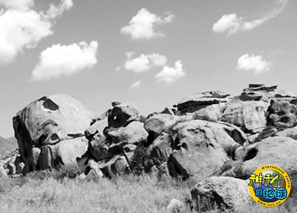 在这些石碓的周围,还可以看到半隐半现的散石,其实它们是围绕着石碓的同心圆,圆圈和石碓由放射状的线条连接,它们构成的图形只有站在制高点才能看得清楚。一种观点认为,立有石人的墓葬并不仅仅是死者的坟墓,可能还是部落的祭祀场所。